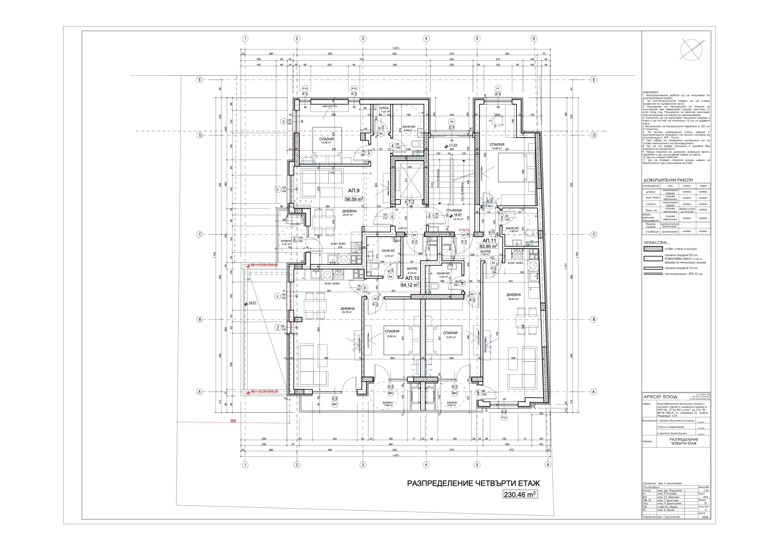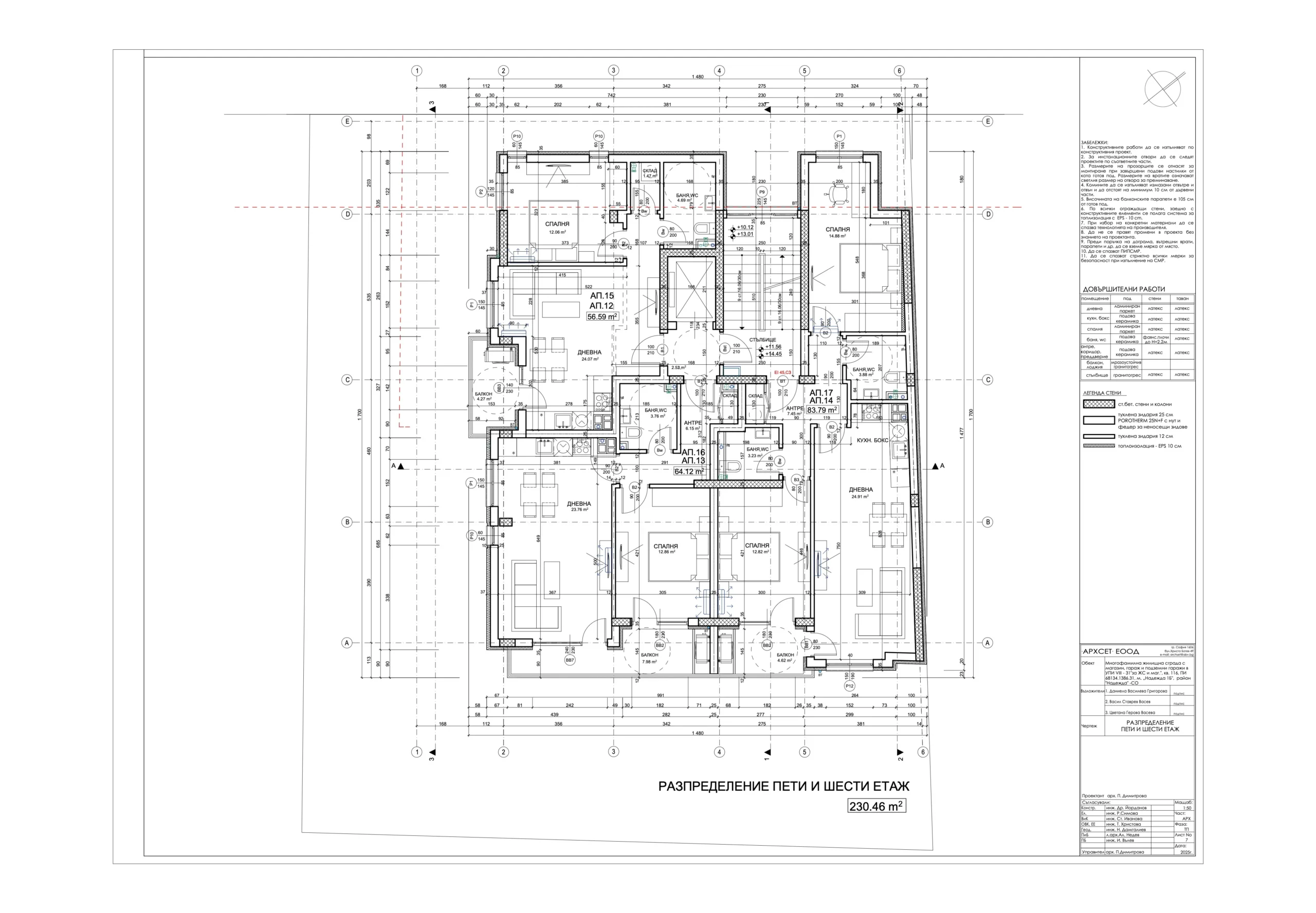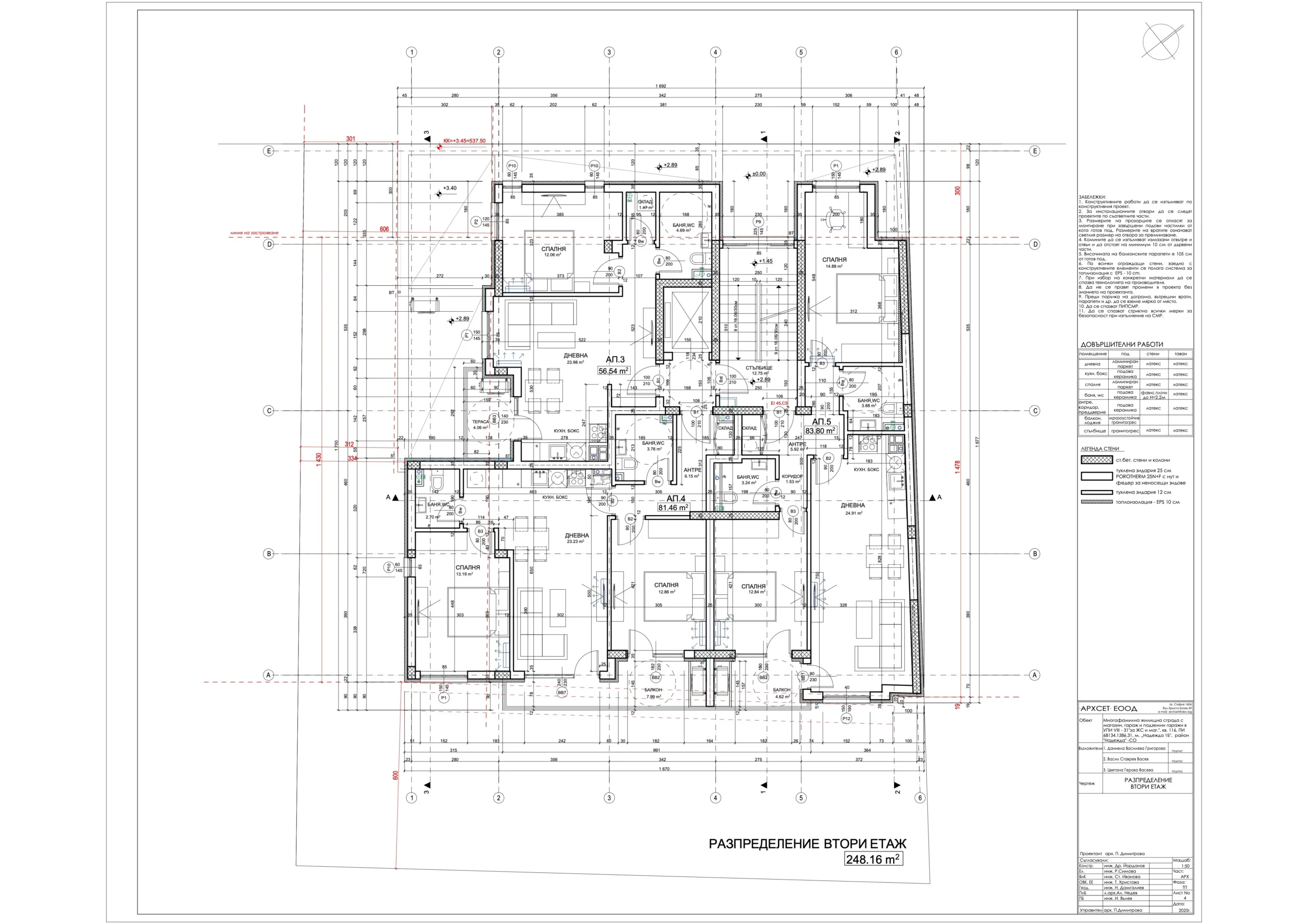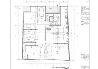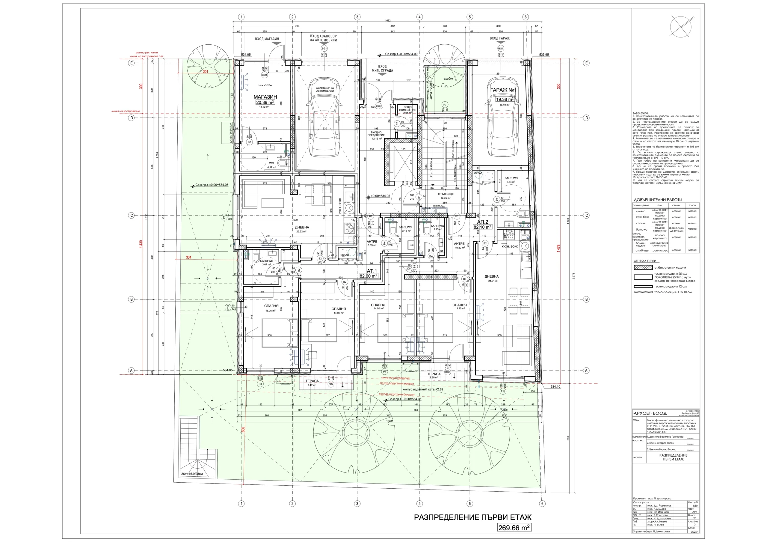 В сградата са обособени 19 просторни и добре осветени апартамента с разнообразни разпределения – 2-стайни и 3-стайни жилища, магазин, гаражи, подземен паркинг със 17 паркоместа, от които две самостоятелни и 15 осигурени чрез платформи за независимо паркиране на две нива; 30 места за велосипеди