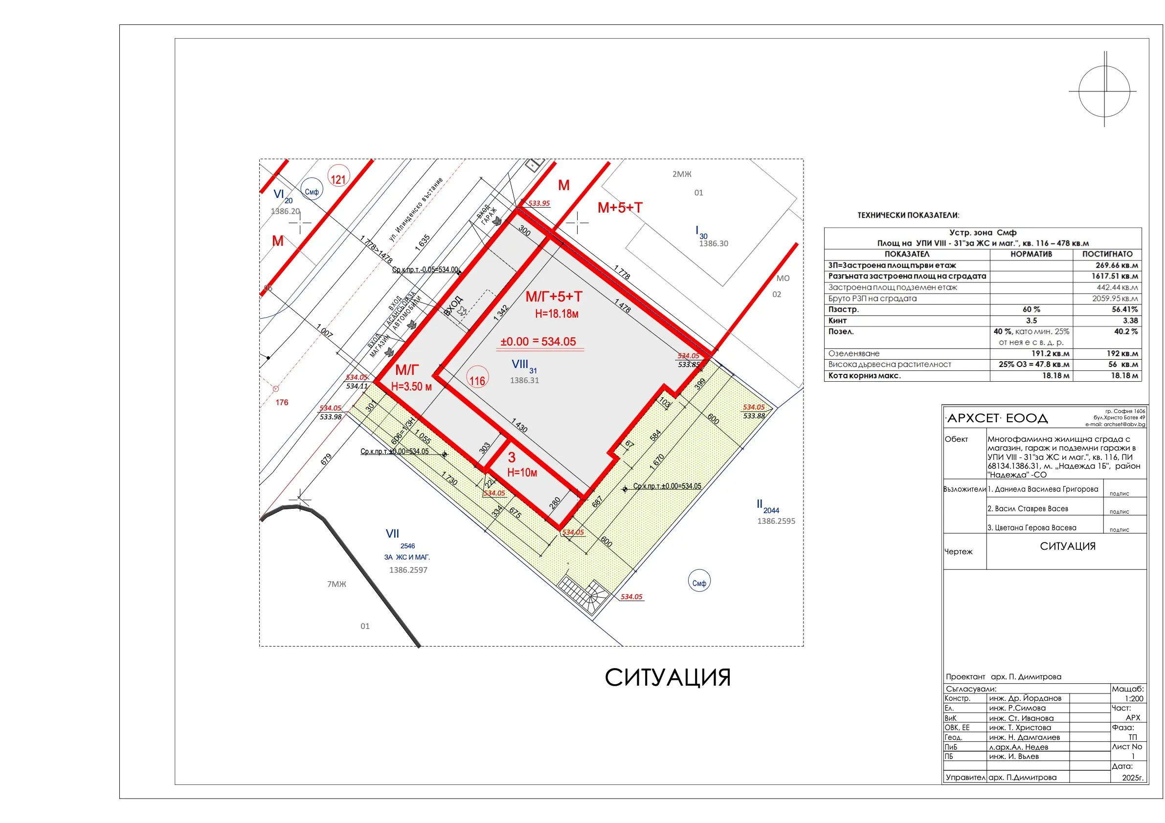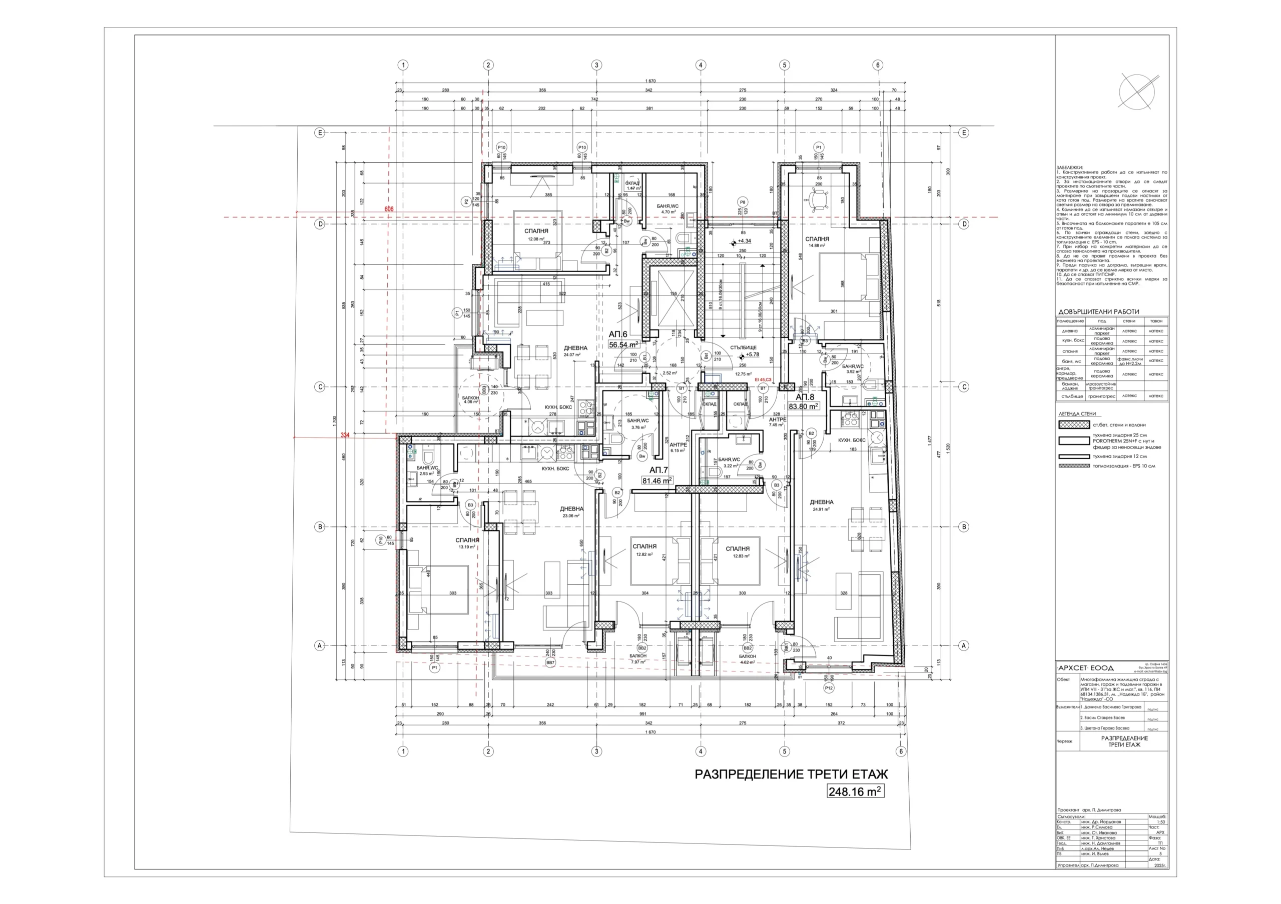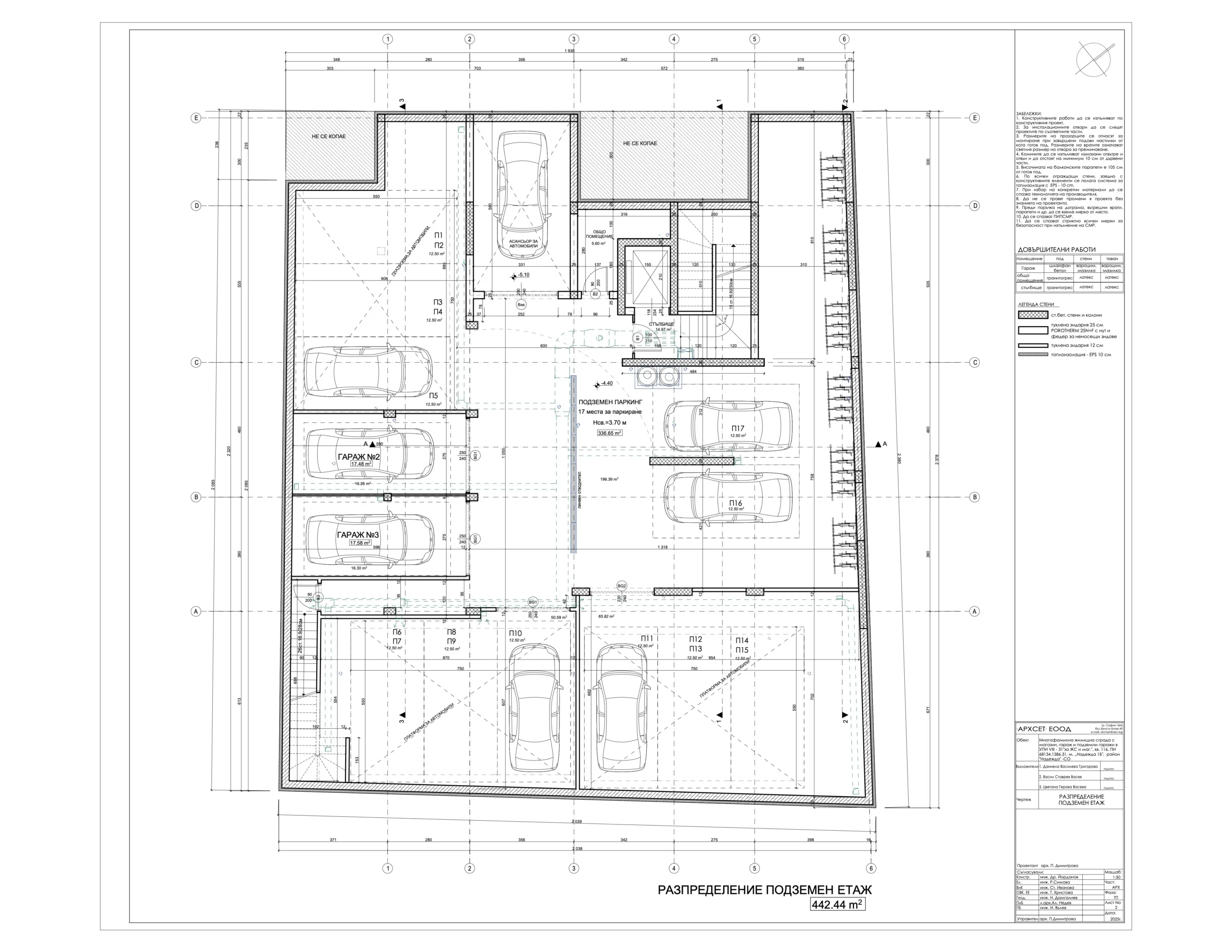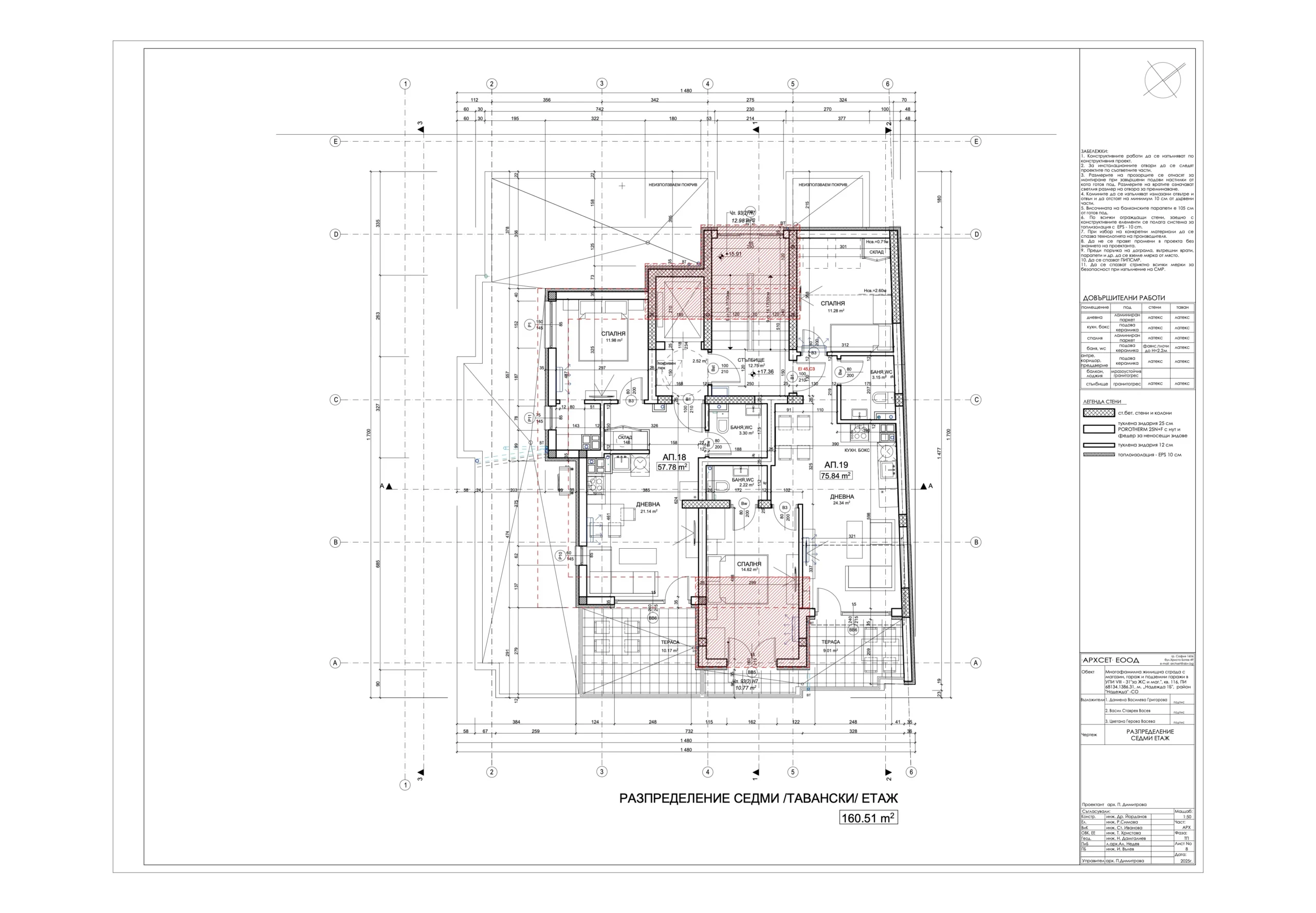 В сградата са обособени 19 просторни и добре осветени апартамента с разнообразни разпределения – 2-стайни и 3-стайни жилища, магазин, гаражи, подземен паркинг със 17 паркоместа, от които две самостоятелни и 15 осигурени чрез платформи за независимо паркиране на две нива; 30 места за велосипеди