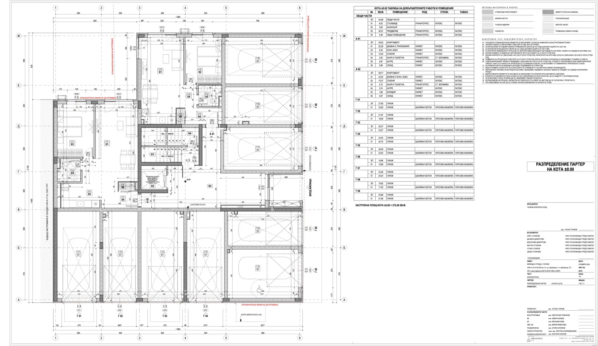 В приземния етаж на сградата са разположени гаражи, както и обособено затворено пространство за автомобилен асансьор с вход откъм ул. 269, обслужващ подземния етаж. В подземният етаж са разположени гаражи, паркоместа и складови помещения.